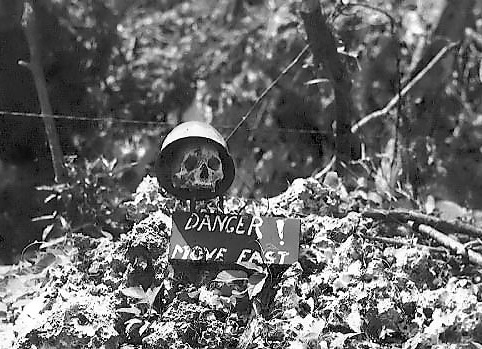 1945 image of a Japanese soldier's decapitated head hung on a tree branch, presumably by American soldiers